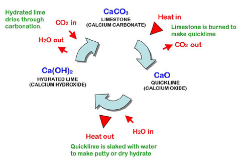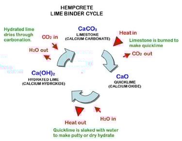Note: CaCo3 (limestone) goes the full circle from being broken down to carbonation when Hempcrete is formed. As the Hempcrete hardens from carbonation, it will eventually petrify the hemp and form limestone.