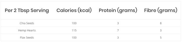 These days, flax seeds can be found in a wide variety of foods. Something often overlooked is that whole flax seeds don’t break down when eaten - they go right through the digestive tract without bestowing any of their many benefits. Make sure you grind the seeds yourself (coffee grinders work well) or use pre-ground flax seeds to get the most value.Flaxseeds contain lignens that are chemical compounds that carry antioxidants and enzymes that have many benefits. Flax is also a good source of a type of soluble fibre that helps maintain ideal cholesterol levels. It provides Omega-6 fatty acids and many essential minerals.Ground flaxseeds can be added to oatmeal, baked goods, smoothies, cereal and more. Like chia seeds, when immersed in liquid, ground flax seeds form a gel, and make a great egg substitute. To replace one egg, combine 1 tablespoon ground flax seeds with 3 tablespoons water. Stir together and let stand for 15 to 30 minutes or until thick and gelatinous.Until recently it has been necessary to buy whole flaxseeds and grind them in a spice or coffee grinder to get their full benefits. Now, pre-ground flaxseeds are available, making them handy to use without extra preparations. Both flaxseeds and flax oil are highly perishable so keep them refrigerated. Another way to reap flaxseeds’ fatty acid benefits is by using the oil in salads or dressings (direct exposure to heat damages the nutrients).Tip: Keep your ground flax in the freezer so it keeps longer and retain nutrients. If you have whole flax keep in a sealable bag or mason jar in the refrigerator as they are highly perishable.Hemp Seeds = 1 tbsp