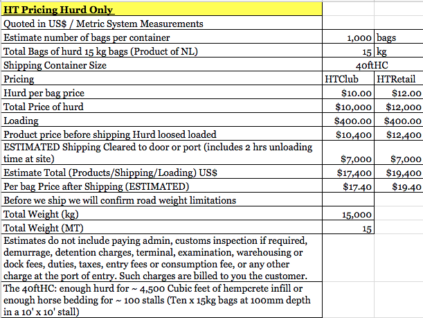 Container pricing - Hemp (Hurd) ONLY